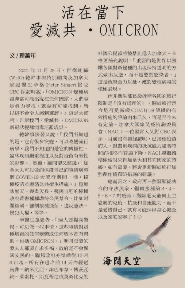 2021年11月28日,世衛組織‧WHO總幹事與特別顧問及加拿大家庭醫生辛格‧Peter Singer接受CBC採訪時說:「omicron變種病毒非常可能出現在任何國家,人們越是努力尋找,就越有可能找到,所以這不會令人感到驚訝。」這是大實話,告訴我們,愛滅共‧Omicron新冠狀變種病毒氾濫成災。