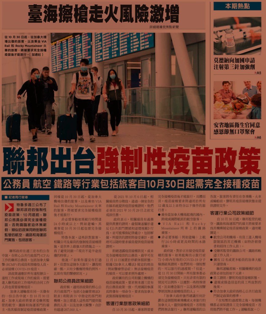 兩年前紅葉燭天,三文魚奮力逆流回歸的時候,一家人就開始留在安省活動。說得準確點是逐漸被限制在大多倫多萬錦巿1000公里範圍內生活。今年感恩節後,就那裡都去不了。聯邦三級政府為我們好,實行強制疫苗政策。無論您走進那家食肆吃飯,服務員都請您提供疫苗接種證明或者護照,如果您沒有那些證明,那頓飯就得坐在戶外和著秋風吃了。